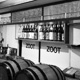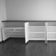 | 厨房の下がり壁のサイズに合わせたグラス収納棚。厨房での使い勝手を重視した酒・皿の収納棚。そして傷がつきにくく清掃のしやすいメラミン化粧板のテーブル。サイズ・色・形 全てオリジナルのオーダー什器です。 |